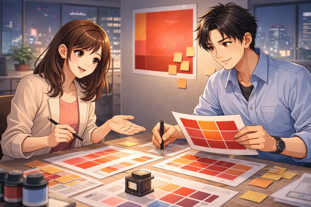 金赤を印刷で使うときに大切なのは、あいまいな言葉のままで進めないことです。「金赤でお願いします」と伝えるだけでは、発注側と印刷会社のあいだで微妙な認識の差が生まれる可能性があります。ここでは、金赤のイメージを正確に共有するために実践したい具体的な確認方法について、順を追って解説していきます。