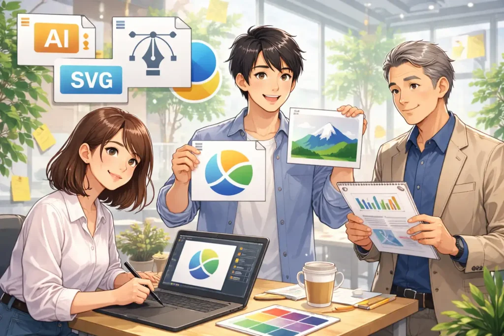 一方で、写真のような細かな色の変化や質感の表現には向いていないという側面もあります。そのため、用途に応じてビットマップ画像と使い分けることが大切です。ベクター画像は主にSVG、AI、PDFといった拡張子で扱われ、それぞれ制作、Web掲載、共有や印刷などの場面で役割が異なります。適切な形式を選ぶことで、スムーズにデータを活用できます。