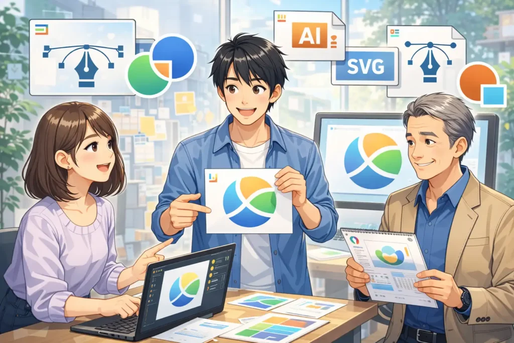 代表的な拡張子にはSVG、AI、PDFがあります。SVGはWeb向け、AIは制作データ、PDFは共有や印刷に向いているなど、それぞれ用途が異なります。