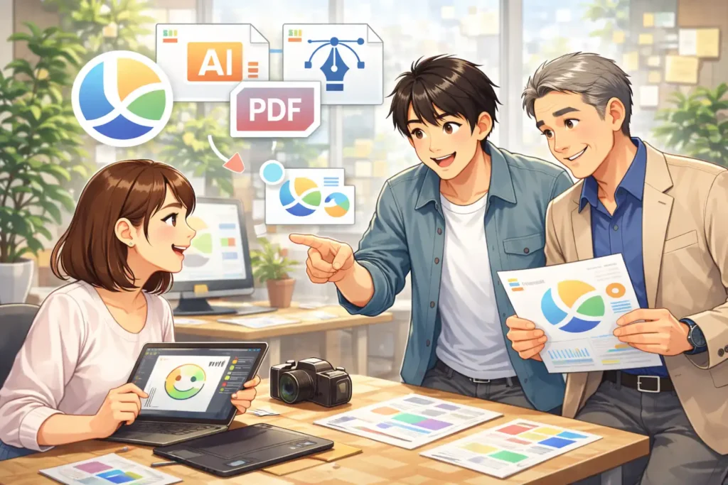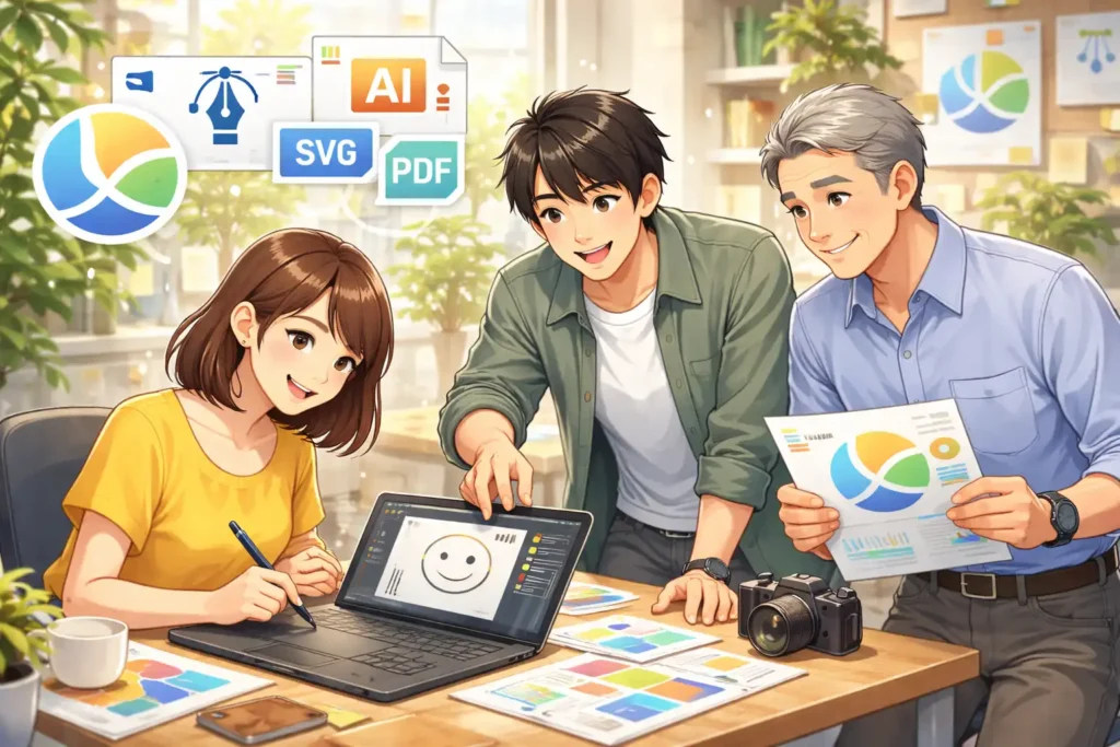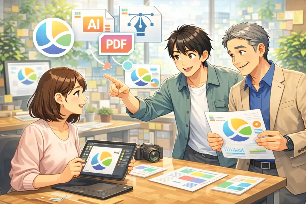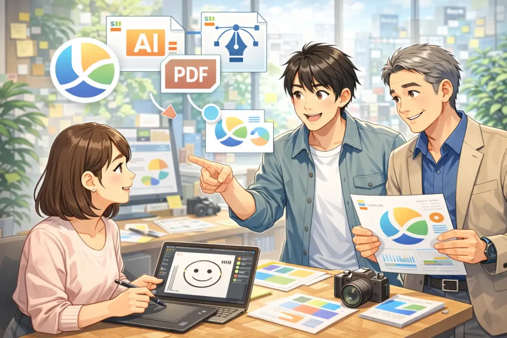 PDFは多くの環境で表示できるため、印刷会社や取引先との共有に適しています。ベクター情報を保ったまま配布できる点が大きな利点です。